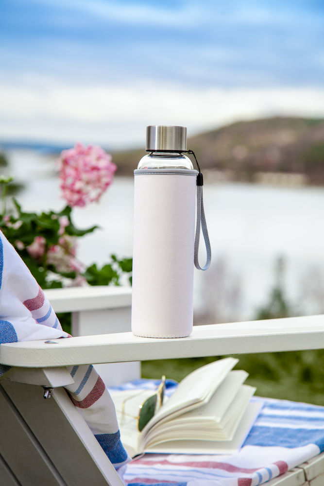 Glasflaske inkl. en neopren taske i flere farver, der passer til den enkelte person, praktisk og flasken tåler maskinvask