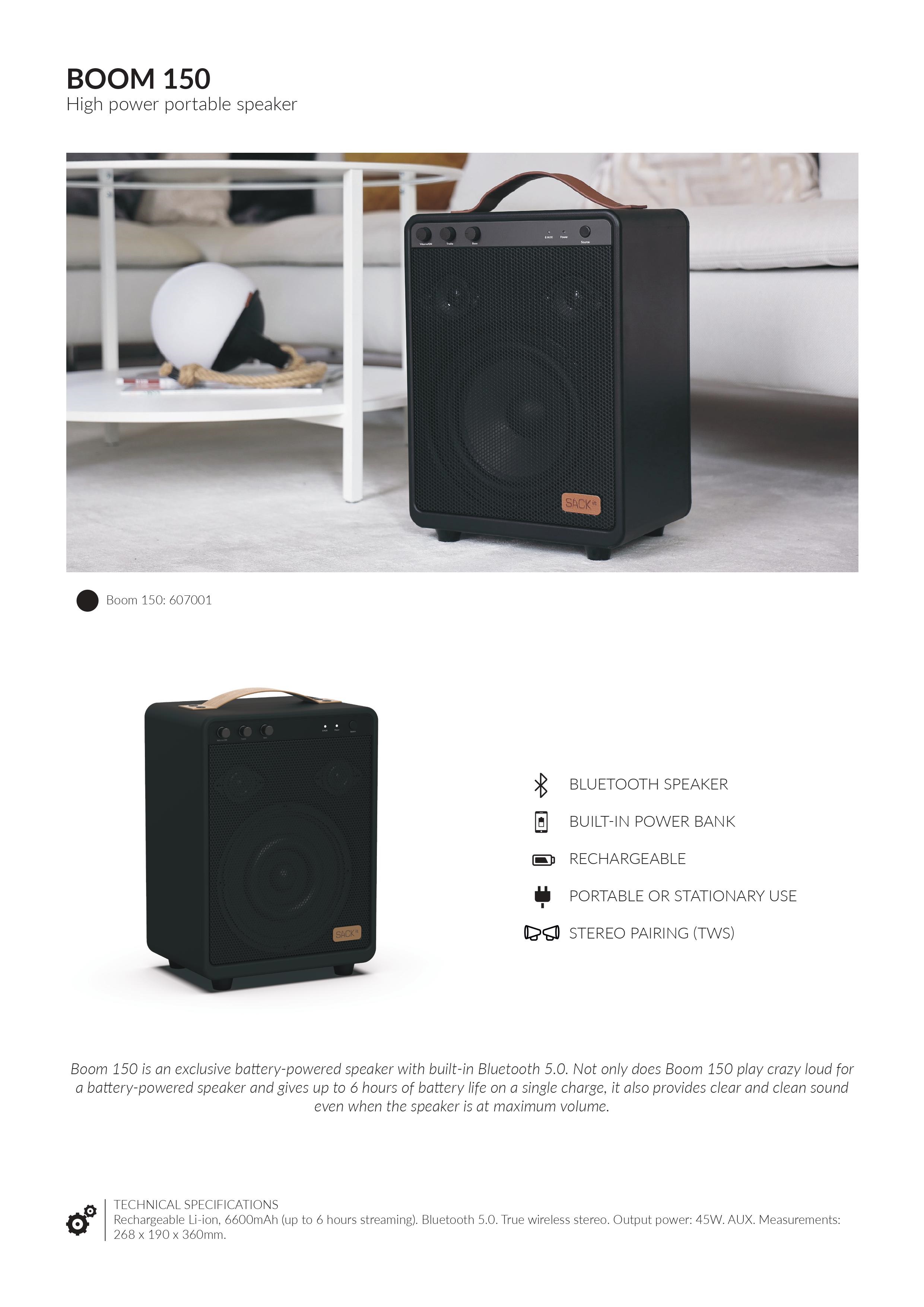 Er du klar til at feste og skal du skabe en feststemning et sted uden stikkontakt? Går telefonen tør for strøm undervejs? Så er det denne Boom 150 højtaler du mangler,  den fungerer nemlig som powerbank samtidig med den spiller