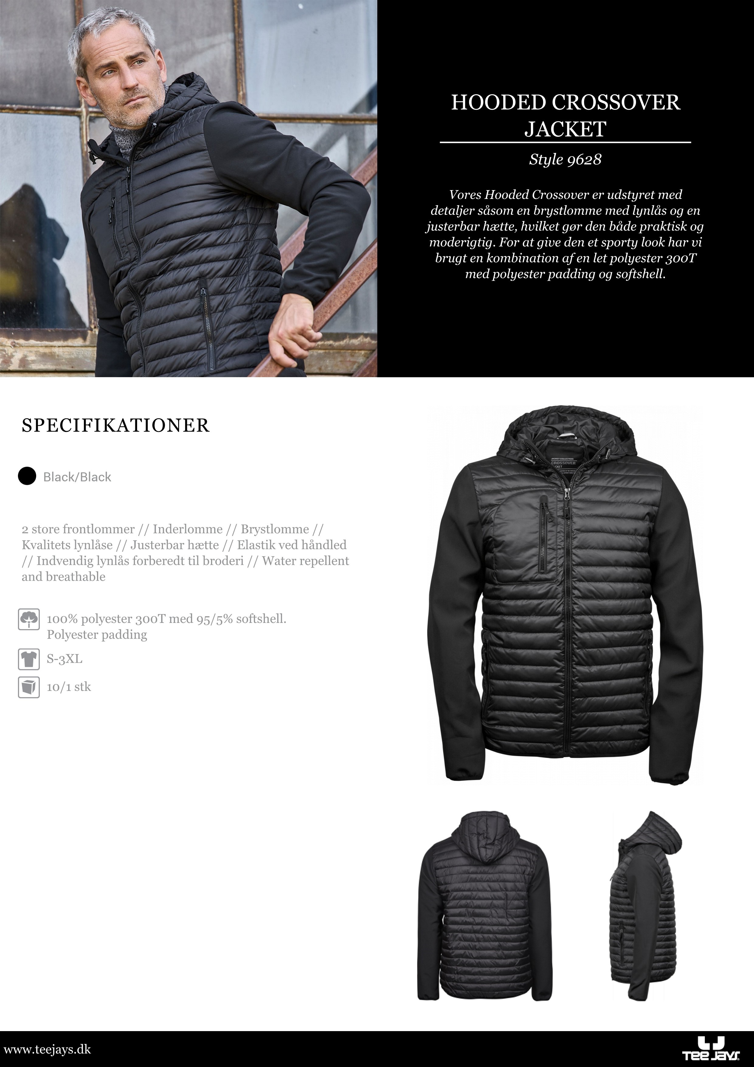Vores Hooded Crossover er udstyret med detaljer såsom en brystlomme med lynlås og en justerbar hætte, hvilket gør den både praktisk og moderigtig. For at give den et sporty look har vi brugt en kombination af en let polyester 300T med polyester padding og softshell