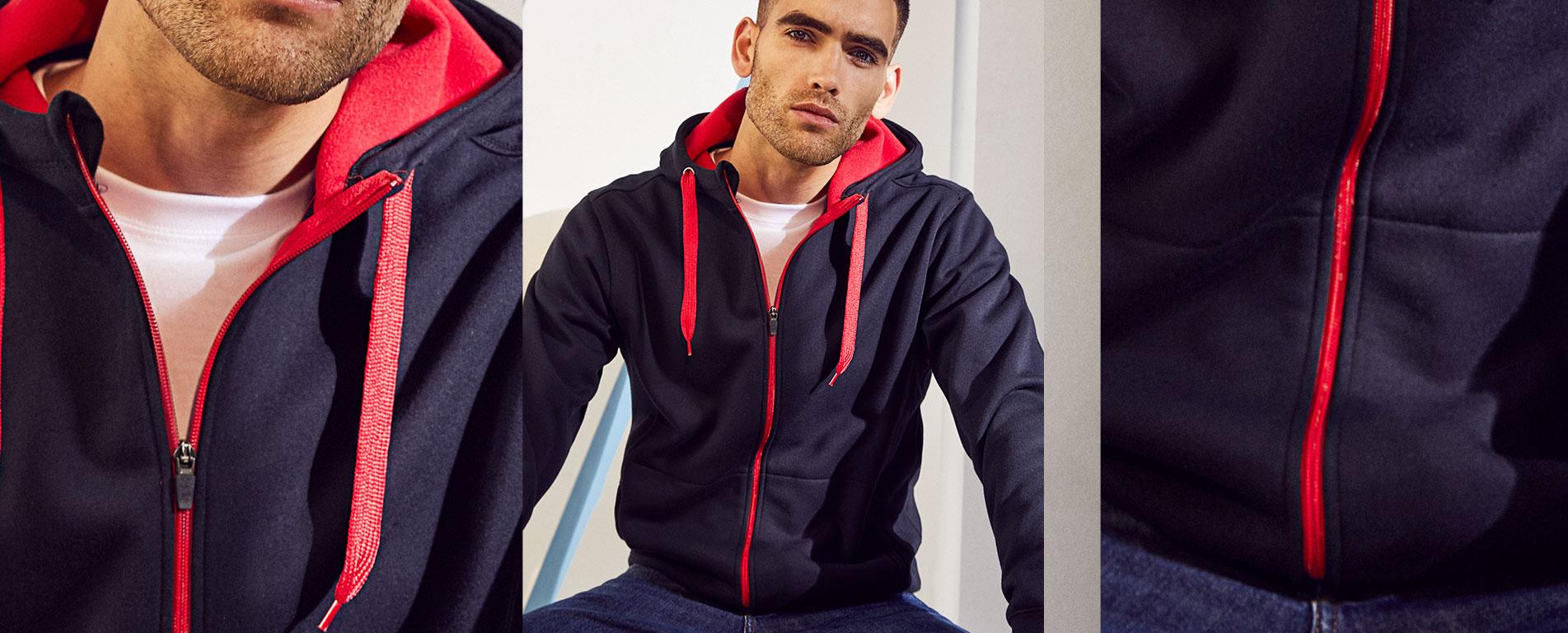 Bonded herre cardigan med blød fleeceinderside. Smart hættemodel med kontrastfarvet snøre, lynlås og inderside. To sidelommer med lynlås.