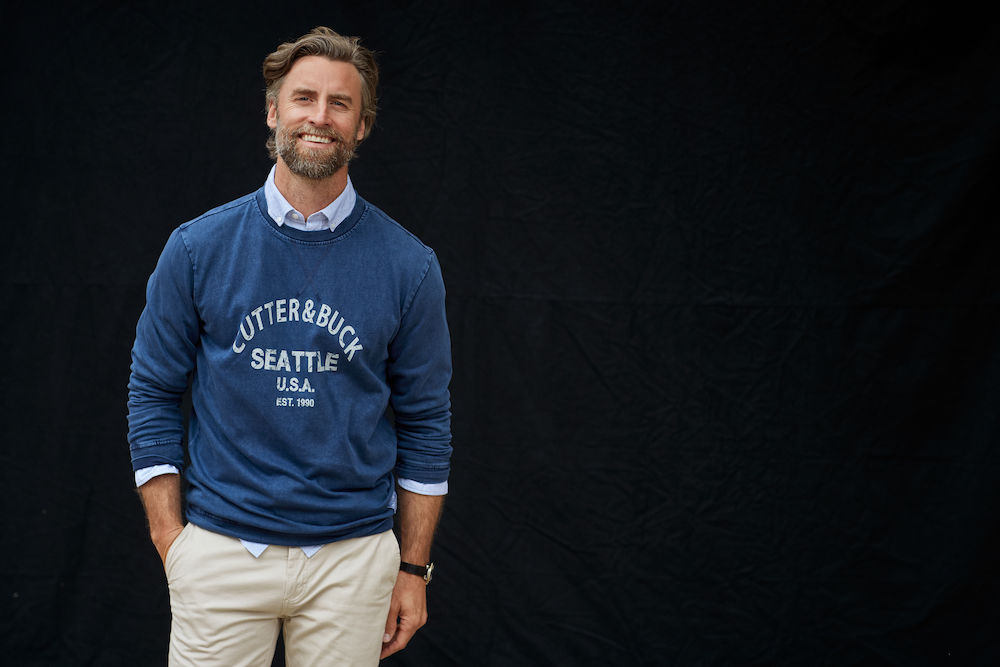 Varm og behagelig indigo farvet rundhalset sweater, med printet logo på fronten. Single jersey foring inde i hætten. Meget blød finish. Rib forneden og ærmer. Damemodel uden rib i bunden