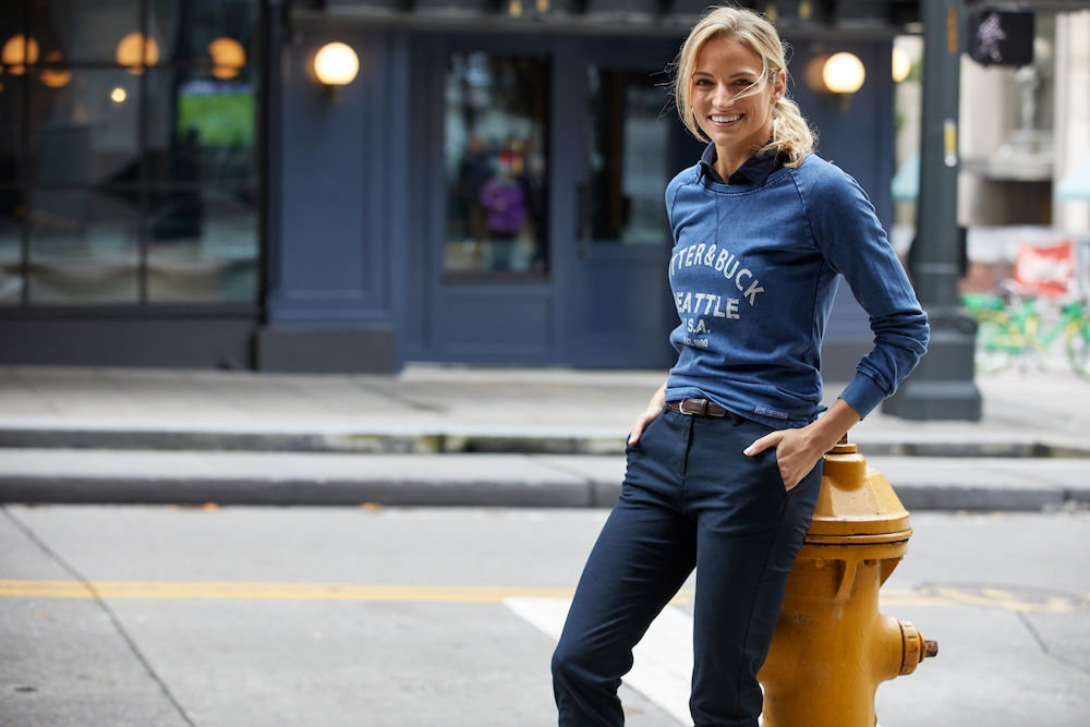 Varm og behagelig indigo farvet rundhalset sweater, med printet logo på fronten. Single jersey foring inde i hætten. Meget blød finish. Rib forneden og ærmer. Damemodel uden rib i bunden